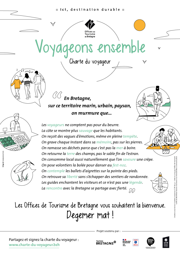 Tous les voyageurs, les organismes de gestion de destination et tous les professionnels du tourisme sont invités à partager la charte du voyageur. Véritable outil fédérateur autour de l’accueil des visiteurs, cette charte se veut être un miroir de l’identité de la Bretagne au travers de ses valeurs.