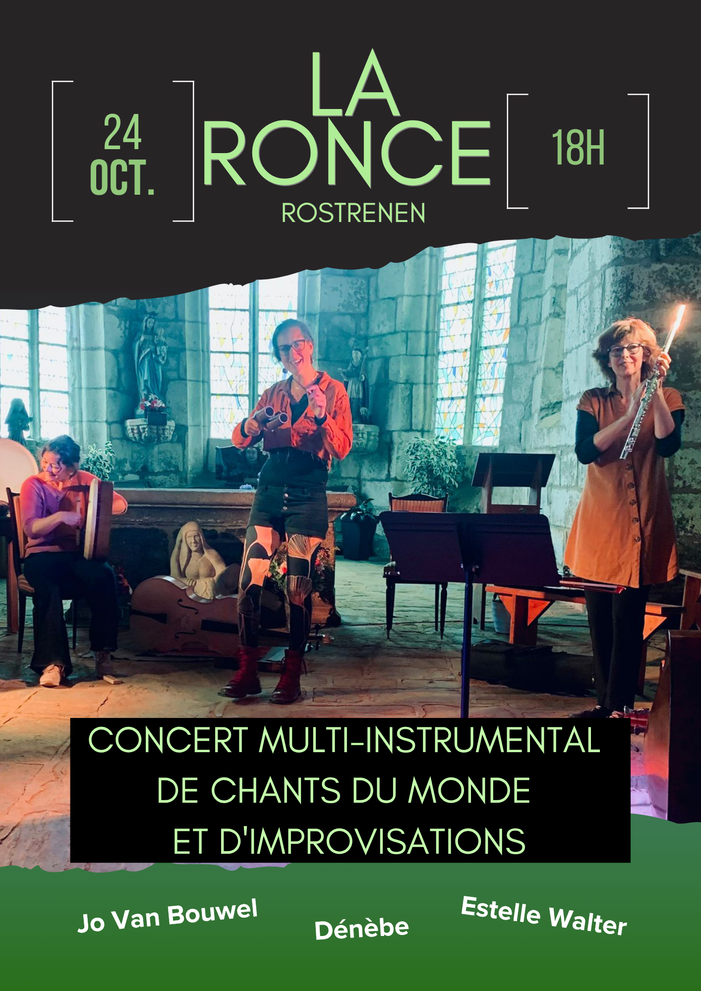 Estelle, Jo et Dénèbe vous invitent à un concert virevoltant entre chants d’ici et d’ailleurs et improvisations, au son d’une dizaine d’instruments. De joyeuses notes jusqu’à l’oreille, de jolis sons jusqu’aux cœurs.