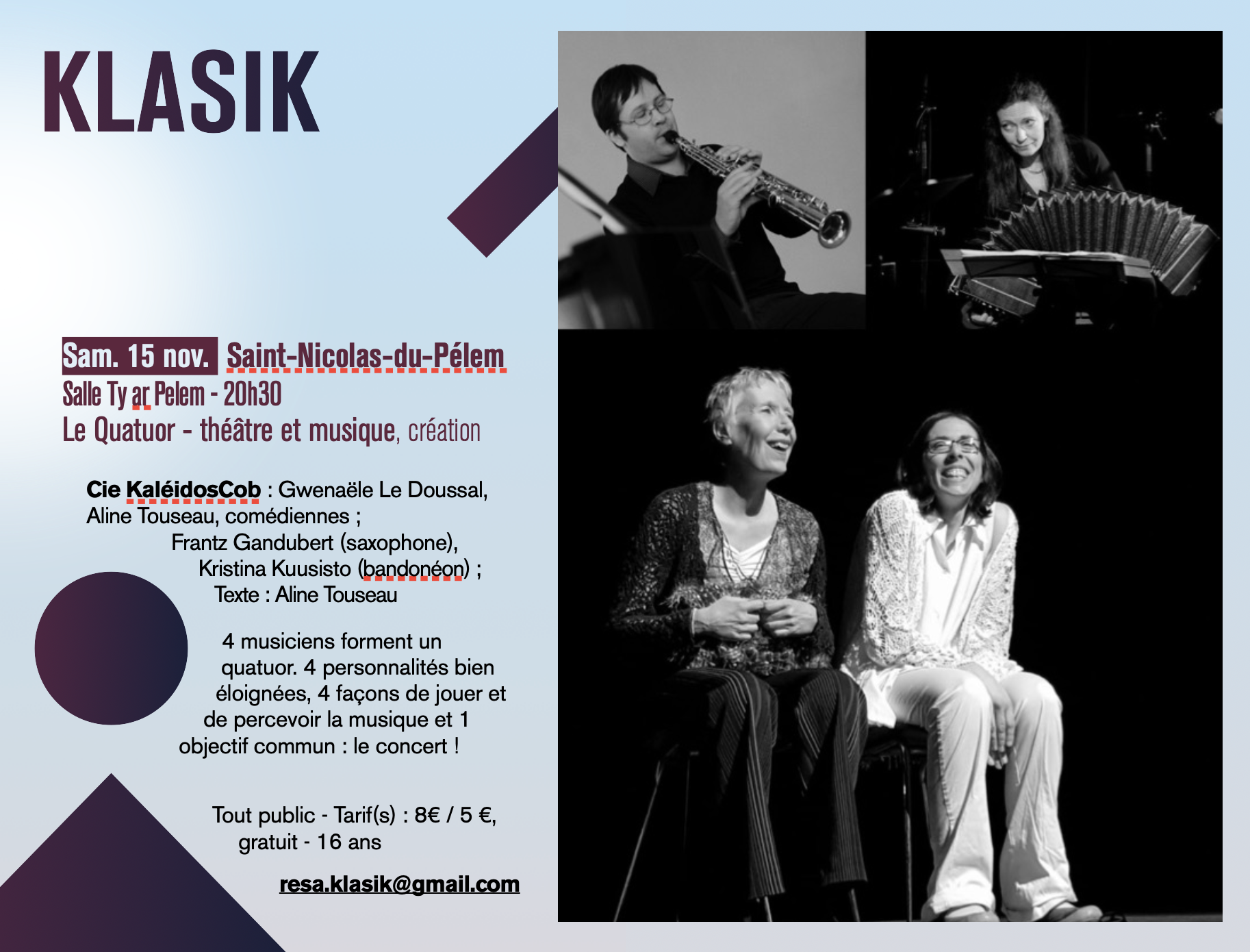 Cie KaléidosCob : Gwenaële Le Doussal, Aline Touseau, comédiennes ; Frantz Gandubert (saxophone), Kristina Kuusisto (bandonéon) ; Texte : Aline Touseau