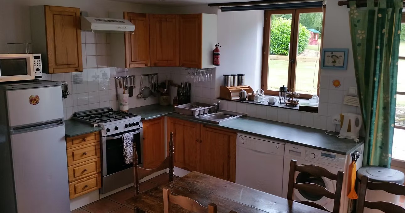 Le gîte offre une cuisine entièrement équipée, un espace salon convivial avec poêle à bois et télévision.