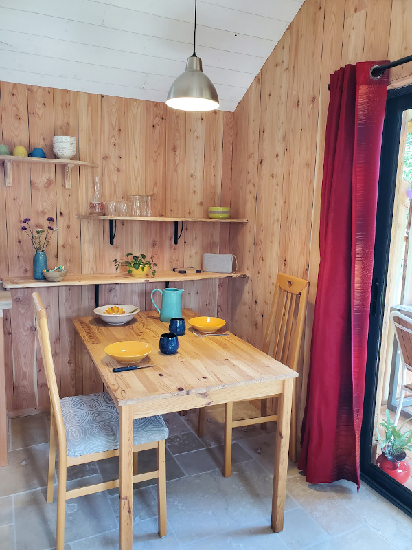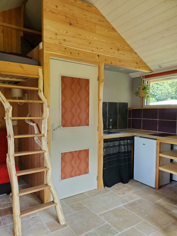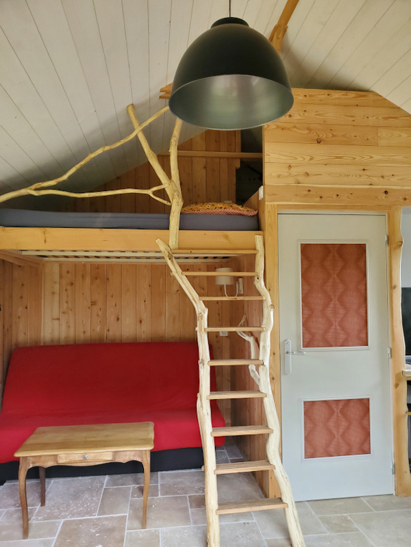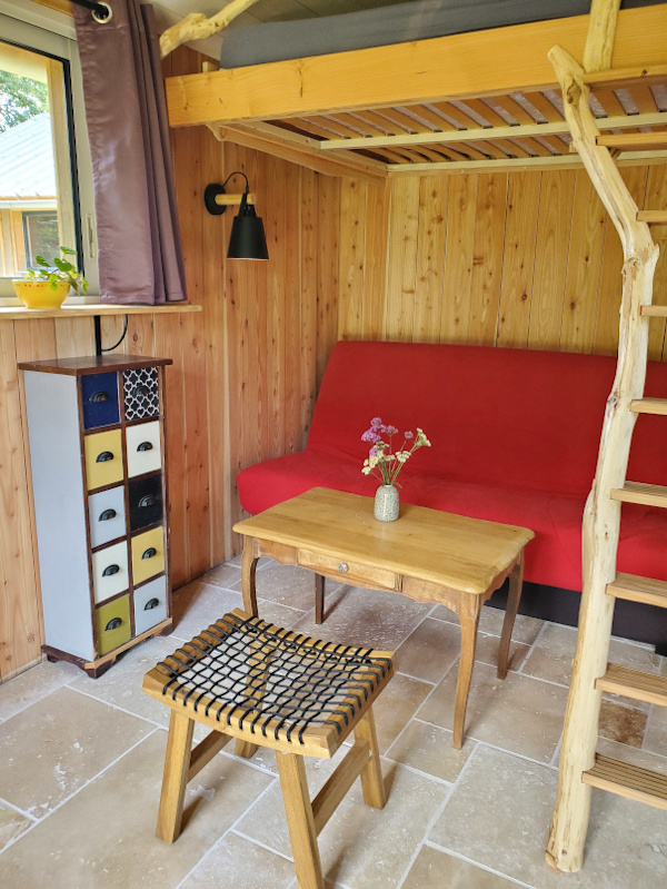 Elle comprend une cuisine équipée, salle à manger, salon avec canapé convertible, un lit deux places en mezzanine, une douche et des toilettes.