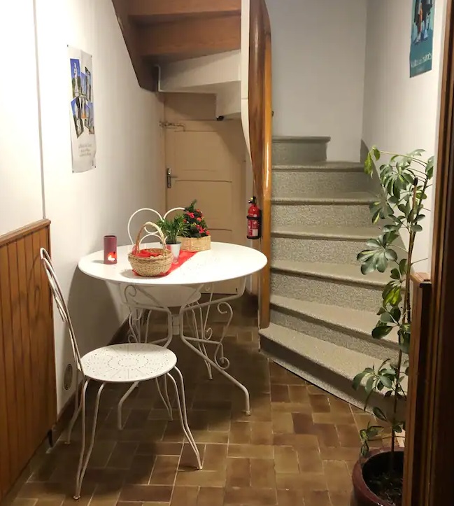 1 appartement à l’étage avec 1 chambre (1 lit 2pers.), salon avec TV et 1 coin cuisine équipée (micro-onde…) , une salle d’eau avec WC et douche, terrasse commune.