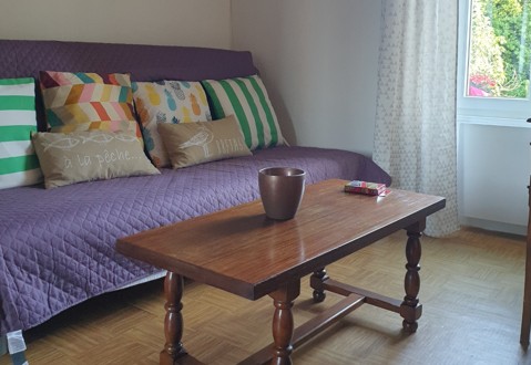 T2 : 1 chambre (1 lit 2pers.) et 1 salon avec TV (canapé convertible) et cuisine équipée (micro-onde…), une salle d’eau avec WC, terrasse commune.